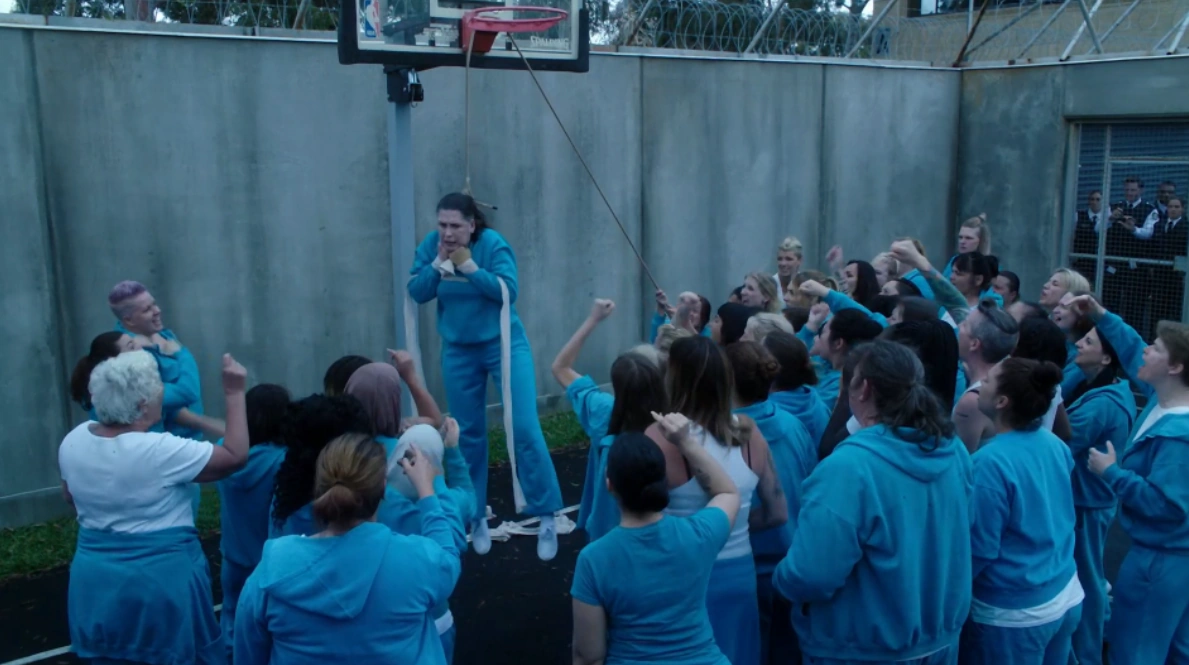 As the prison goes into lockdown, Ferguson is paraded through the yard to the basketball hoop, where Ferguson is tied up for all the women to see, Tina comes over and asks what the hell is going on, Kaz tells her to calm down as she says it is a chance to be heard without the feeling of fear by Ferguson's terrorising of the women, Hutchins tries to attack Kaz for this but is pushed back as Joan tells them no, Vera rushes into the governors office and tells Channing that they need to go in there and clear out the yard, Will says it is easier said then done as Linda is a hostage and the women are threatening Ferguson. Kaz tells the women if they want someone like Ferguson in charge of them, Tina says that Ferguson is top dog and the only way to challenge her is one-on-one while Kim tells her 'are you gonna do that..', Linda who is watching on as a hostage, turns on her radio volume on so the people in the governors office/outside can hear what the women are talking about as Will hears this and puts the radio on the table so they can listen to what is happening in the yard, Kaz tells the women Joan is only top dog because she declared her self Top Dog in a coup and that they can call vote. Channing repeats and says 'they're having an election.' Vera tells Channing to call in the CSDS, Channing refuses as he tells Vera the women are just talking, as Vera says they have an Officer hostage and the women need to be dispersed, Channing refusing again just says to see how it will play out, Vera tells Channing it wont 'play out well' for Ferguson, Vera refuses to stay in the room and she leaves making her way to the yard, Channing tells her not to interfere with what is going on.