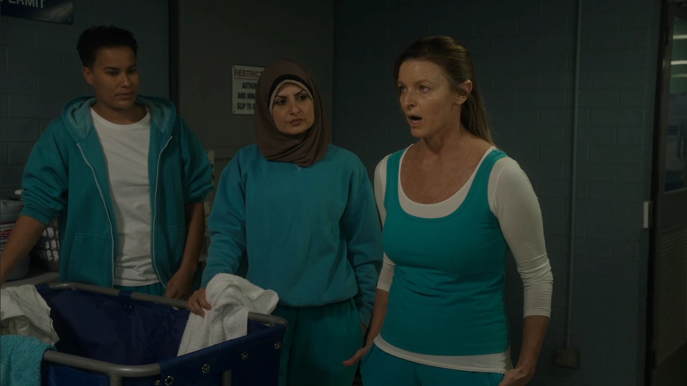 In the dining room, Boomer asks Linda if there is any news on Sonia and Linda just tells her to sit down as Boomer asks her again with Linda not telling her anything as Boomer sits down and the others are eating while Boomer says that she isn't hungry, as Liz and Kaz look at her and Boomer says that she also misses Franky and Allie says that maybe she can visit in disguise, just as some of the women as Lucy Gambaro walks into the dining room after returning from hospital, Boomer asks her how was hospital and if they glued her tongue back on, as Lucy sticks her finger up at her, Boomer says if that was sign language she knows some as well and does the 'up yours" with her arm. Allie and Ruby talk as they joke about what J Block was like as Spike comes in and Ruby asks her how she slept and Spike says poorly and Ruby tells her that is what she gets when you burn your mattress. Spike's girlfriend Sharon tells her to Ruby alone and Spike asks if they are sleeping together and Ruby denies it as she says something else and the two end up having a tussle, Kaz breaks it up and says that things are different in their unit and Spike can either get food or get out, Ruby sits back down as Liz asks if she is ok.