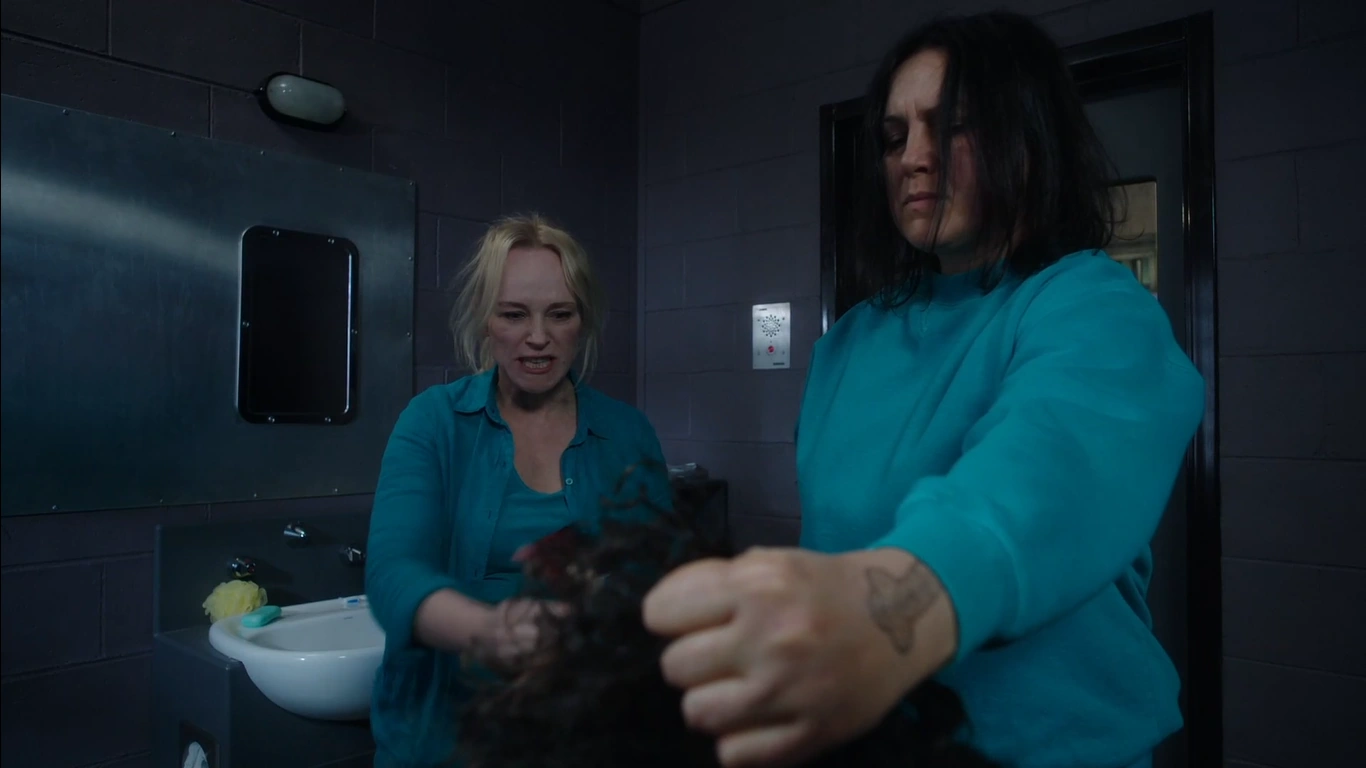 As Linda is walking through the hallway there is an announcement over the PA about the night lockdown and Linda walks past Ruby. Linda walks into the showers and tells the inmates to move out, as Allie is brushing her hair as, Linda tells her that she heard the announcement and Allie says just to give her a second as she is combing out the knots, Linda notices the last inmate leave and tells Allie that she needs to stop the fight. Confused Allie asks what fight and Linda tells her that Boomer and Ruby are set to fight tomorrow, Allie says that if she wants to fight she cannot stop her, Linda tells Allie that she needs to stop her from fighting but stops herself, Allie wants to know what. Linda reveals that Ruby has a brain aneurysm that was picked up after her trip to hospital and says that if she gets a hard hit to the head it would kill her, Allie looks on in shock.